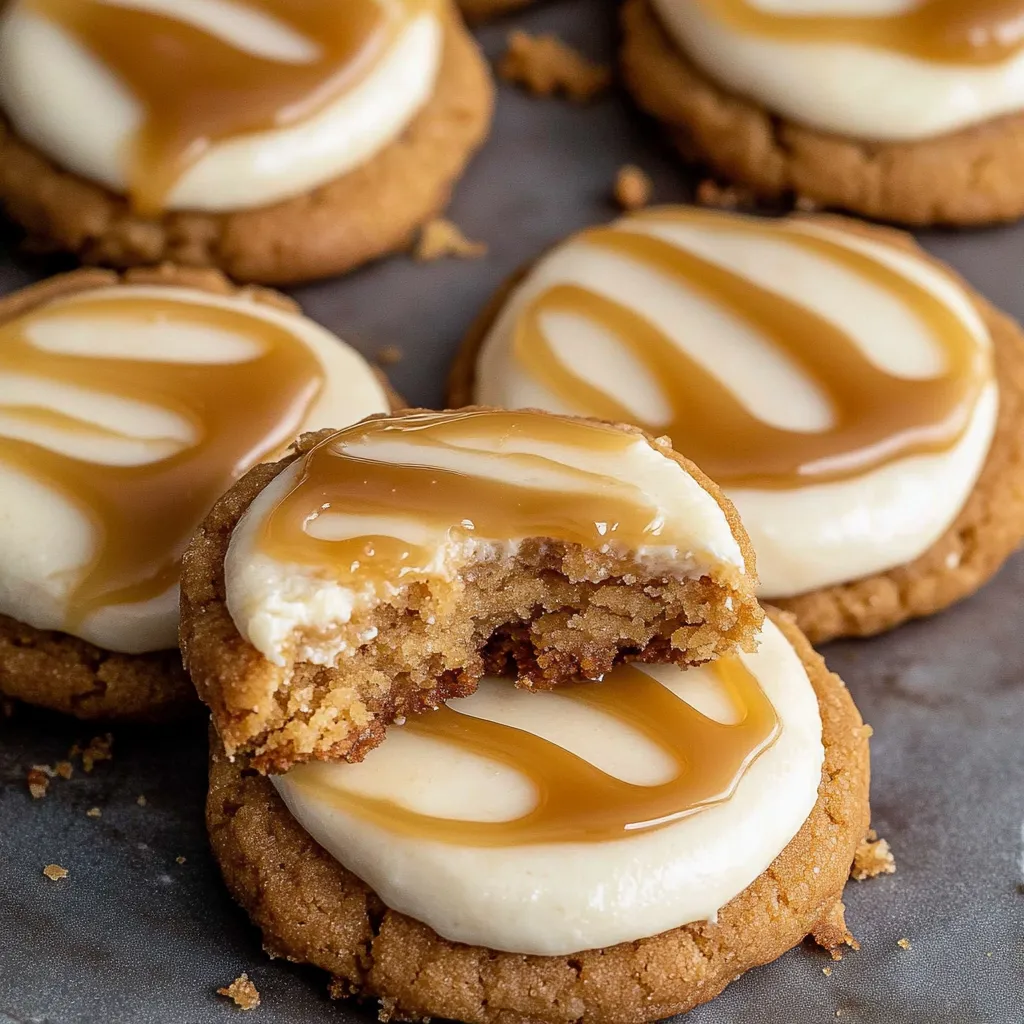 Indulgent cookies with a creamy cheesecake filling, topped with caramel drizzle and flaky sea salt for a perfect sweet-salty balance.